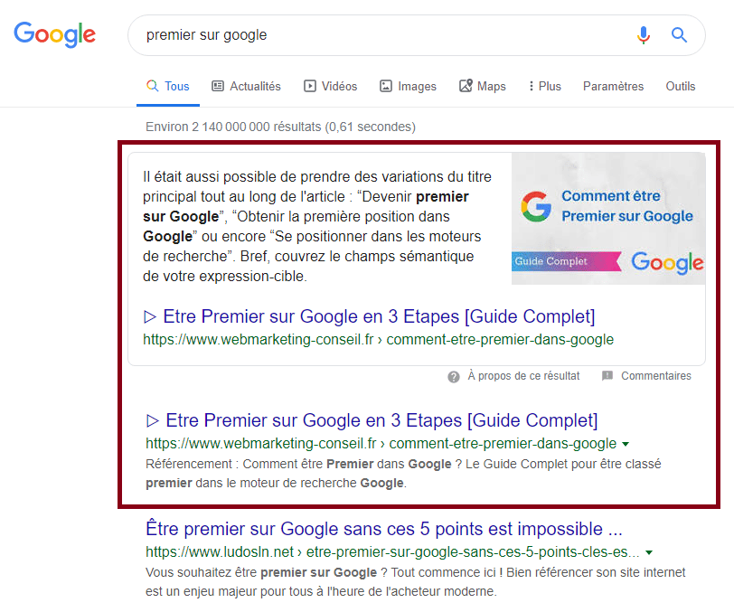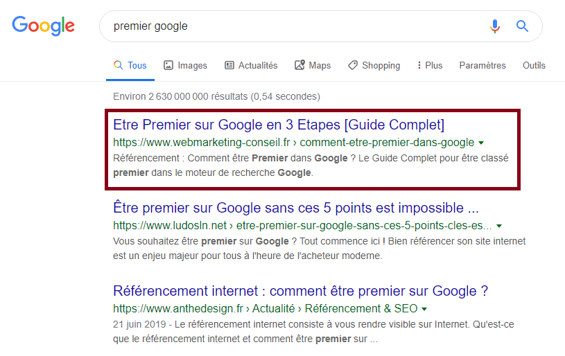 À titre d’exemple, pour cet article, j’aurais pu viser « positionner un mot-clé dans les moteurs de recherche » ou « optimiser son référencement sur Google ». Mais mes lecteurs ne sont pas des experts. Ce qui les intéresse, c’est la promesse concrète : « être le premier sur Google ».