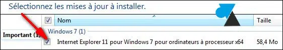 Parmi la liste, repérez la ligne « Internet Explorer 11 pour Windows 7 ». Cochez-la et validez en cliquant sur « OK » pour confirmer votre choix.