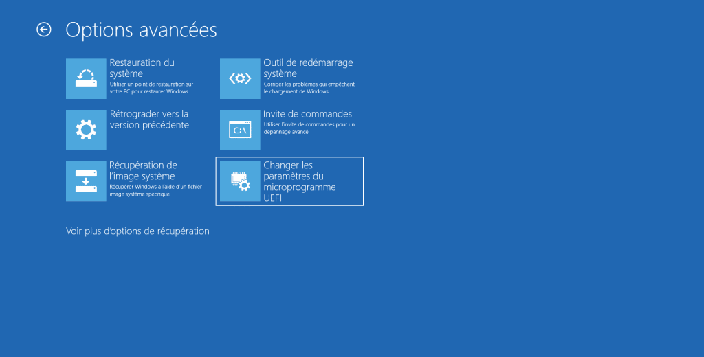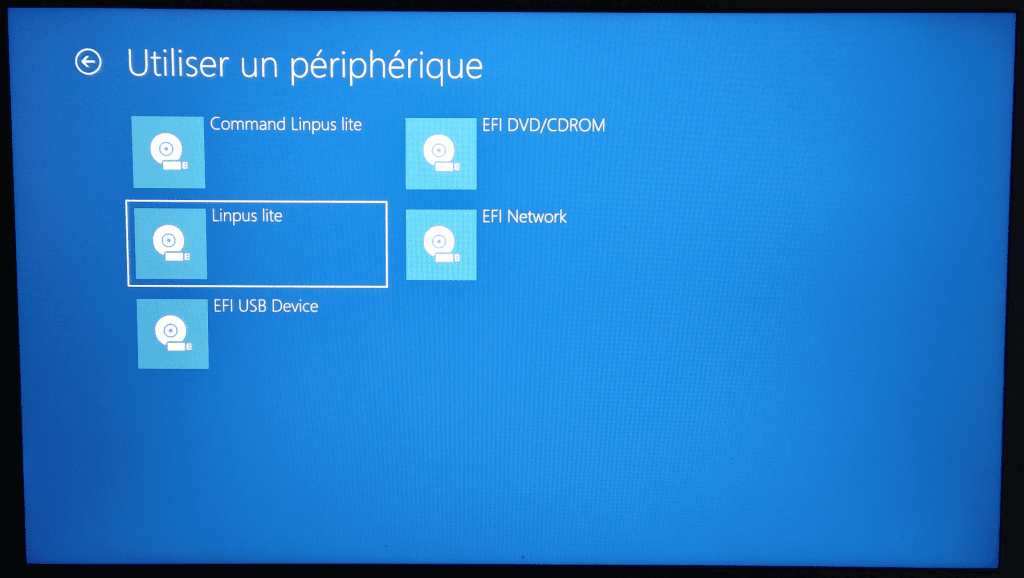 - Redémarrez, puis démarrez sur la clé (depuis « Options de démarrage avancées » de Windows ou via le menu boot du BIOS/UEFI).