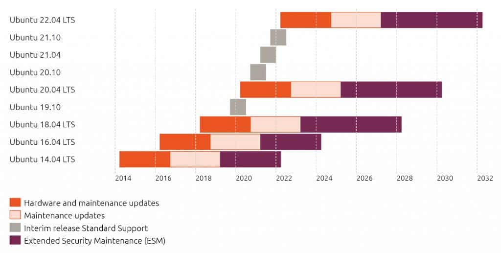 Le calendrier de prise en charge d’Ubuntu varie selon la version choisie : toutes les informations sont disponibles sur le site officiel d’Ubuntu.