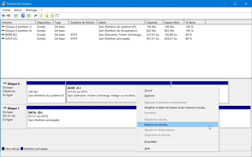 - Identifiez la partition Windows (généralement C:), faites un clic droit et choisissez Réduire le volume.