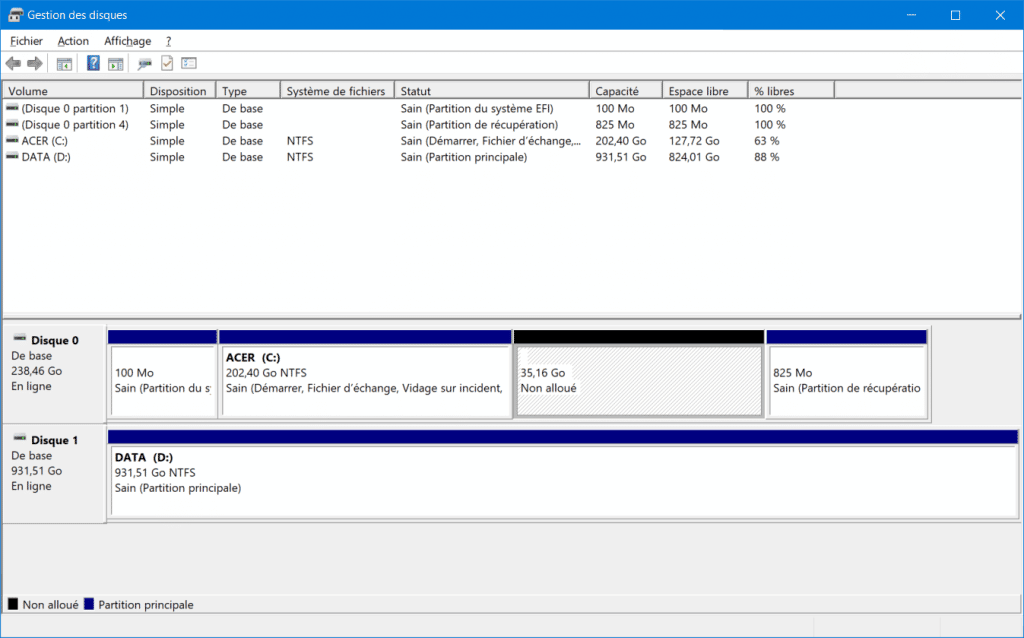- Vous verrez alors une zone « non allouée » sur le disque, parfaite pour l’installation de Linux.