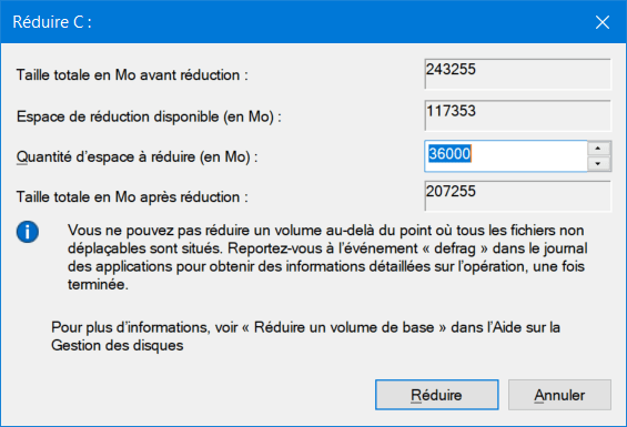 - Déterminez l’espace à libérer : inscrivez la taille souhaitée puis validez. Pour Ubuntu, 15 Go sont un minimum, 25 Go garantissent une grande souplesse. L’illustration montre un espace de 36 Go réservé à Ubuntu.