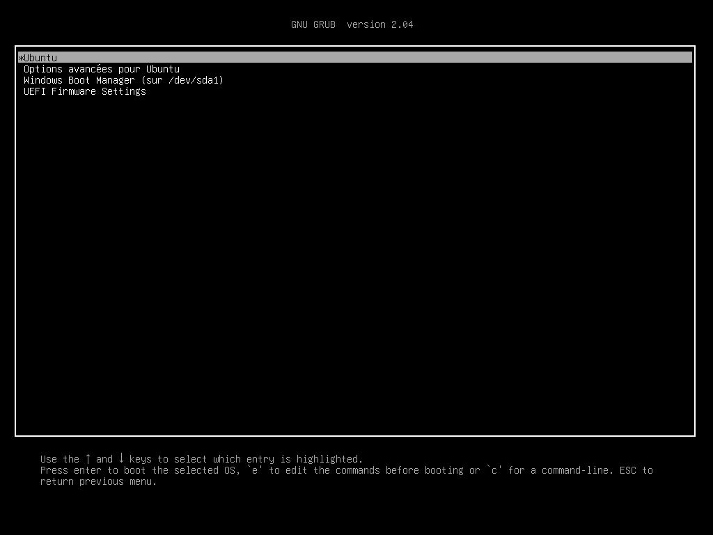 - Lorsque le PC démarre, le gestionnaire GRUB s’affiche.