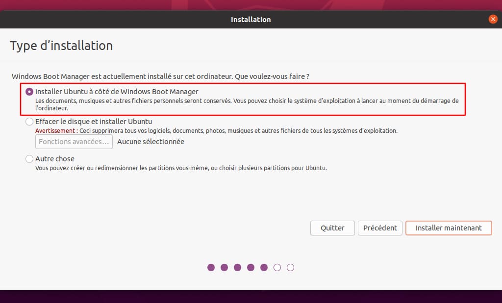 - Sélectionnez Installer Ubuntu à côté du gestionnaire de démarrage Windows et validez.