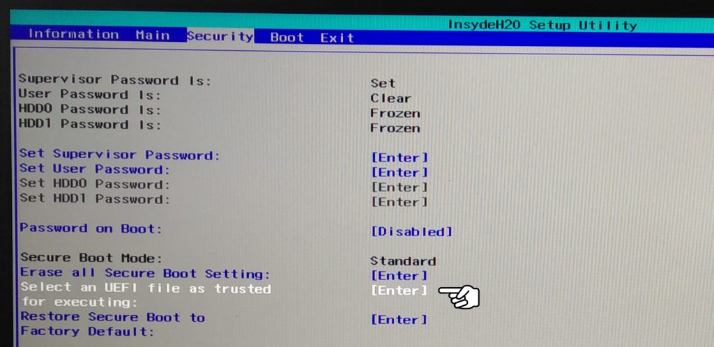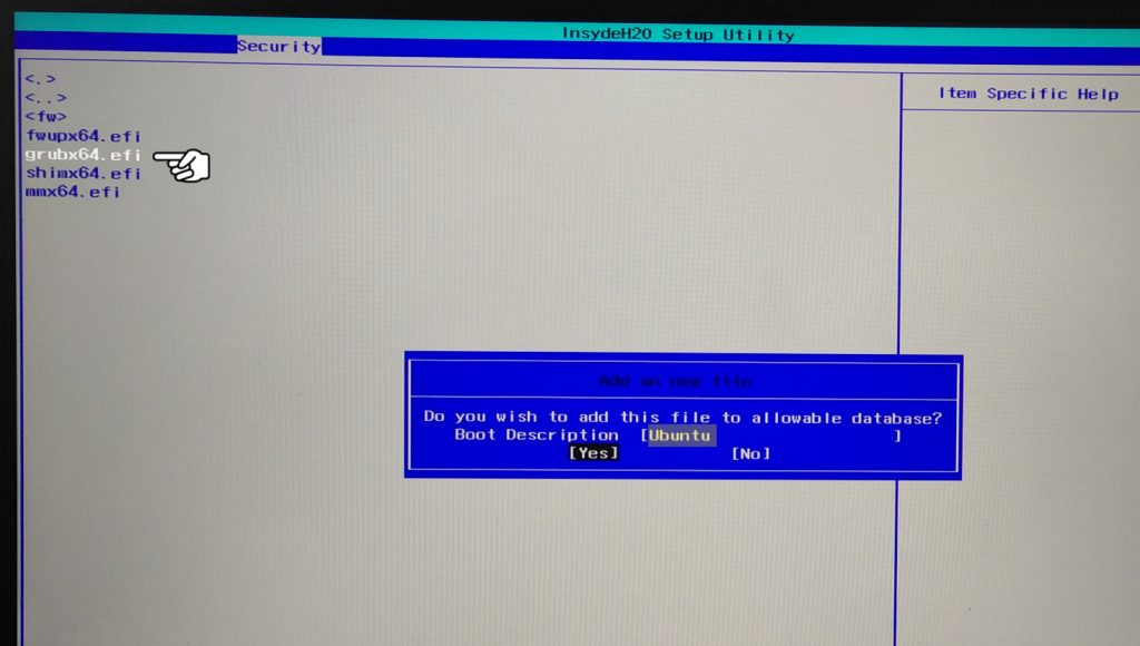 Selon la marque du PC, il peut être nécessaire de marquer le fichier grubx64.efi comme « autorisé » dans le menu de sécurité et de sélectionner ce fichier dans la partition EFI.