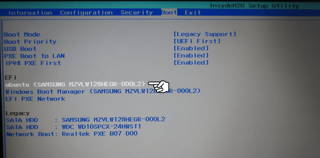 Après redémarrage, revenez dans le menu de configuration UEFI pour vérifier qu’une option « EFI File Boot 0 : Ubuntu » est bien présente et priorisée.